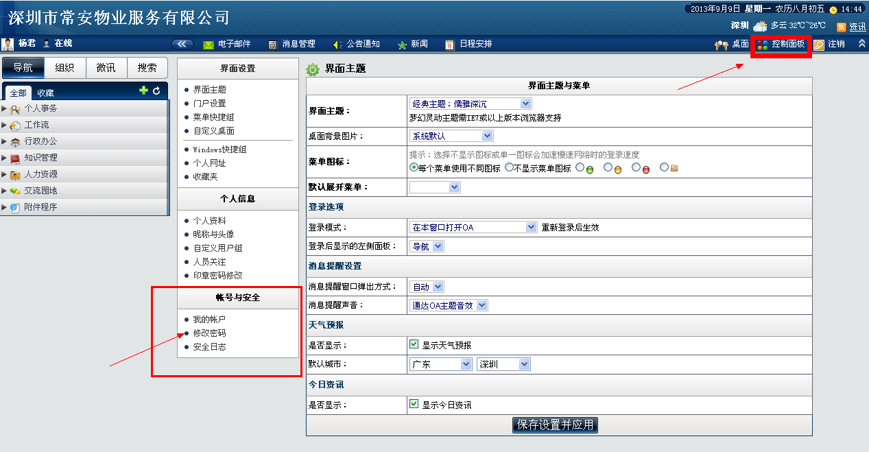 (4)OA地址(內(nèi)網(wǎng))修改成下面內(nèi)容[changanwuye.gicp.net:800]。用戶名首次登陸為自己的名字,沒有密碼。點(diǎn)擊保存。就可以直接登錄了。