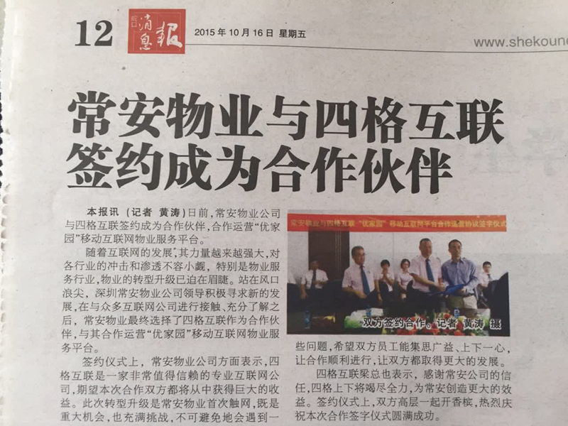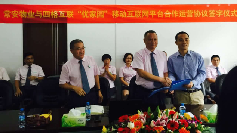 2015年10月10日上午于公司會議室與四格互聯(lián)進行了合作簽字儀式。儀式上,張武董事長表示,四格互聯(lián)是一家非常值得信賴的專業(yè)互聯(lián)網(wǎng)公司,本次合作雙方都將從合作中獲得巨大的收益。公司由于是首次進行此類轉(zhuǎn)型,將不可避免地遇到各種困難,希望雙方員工能集思廣益、上下一心,讓合作順利進行,讓雙方都取得更大的發(fā)展。四格互聯(lián)的梁總表示,感謝常安公司的信任,物業(yè)方面常安是專家,希望得到常安更多的指導(dǎo),四格上下將竭盡全力,為常安創(chuàng)造更大的效益。張總和梁總簽字之后一起開香檳,熱烈慶祝本次合作簽字儀式的圓滿成功。