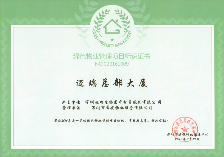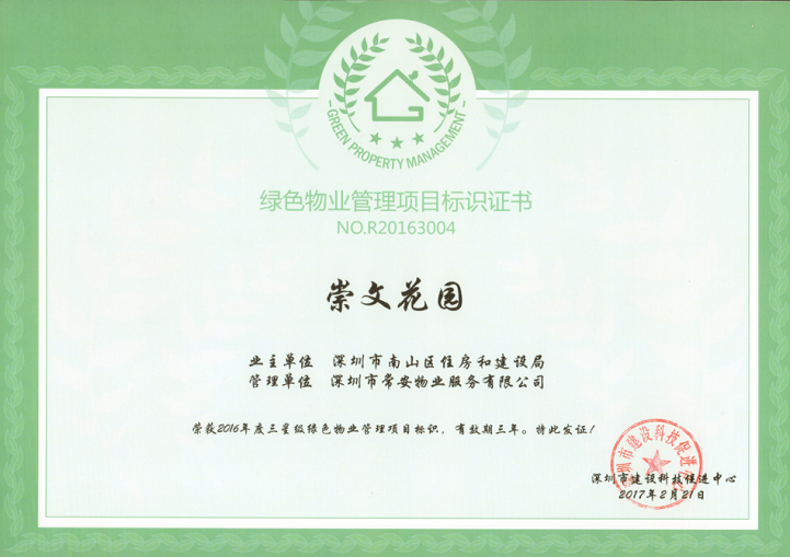 為落實深圳市住建局關(guān)于《深圳市綠色物業(yè)管理導(dǎo)則(試行)》指導(dǎo)精神,在保證物業(yè)服務(wù)質(zhì)量等基本要求的前提下,通過科學(xué)管理、技術(shù)改造和行為引導(dǎo),有效降低各類物業(yè)運行能耗,最大限度地節(jié)約資源和保護環(huán)境,致力構(gòu)建節(jié)能低碳生活社區(qū)的物業(yè)管理活動,實現(xiàn)城市經(jīng)濟社會可持續(xù)發(fā)展目標,提高物業(yè)管理的科技含量和服務(wù)水平。2016年12月,在公司的正確領(lǐng)導(dǎo)和相關(guān)部門的積極配合下,通過項目全體員工的共同努力,我司“崇文花園”項目和“邁瑞總部大廈”項目順利通過了深圳市建設(shè)科技促進中心的相關(guān)評審,分別獲得了“2016年度三星級綠色物業(yè)管理項目”證書和“2016年度一星級綠色物業(yè)管理項目”證書。
